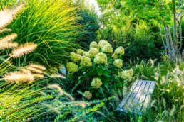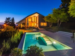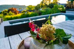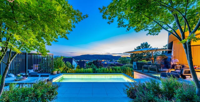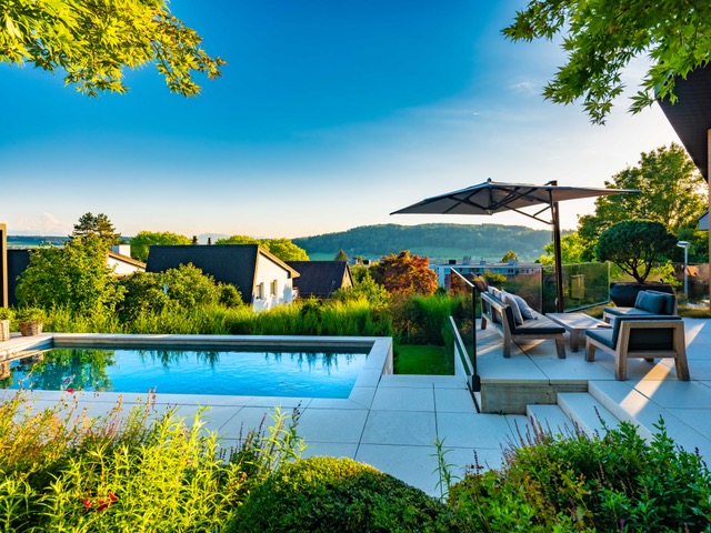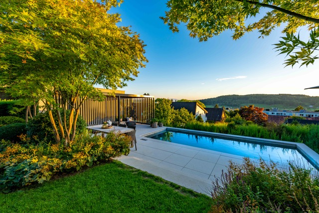 Gesamtkonzeption einer Fläche von 900 m2, Neugestaltung Hauptgarten mit Terrasse und Pool.